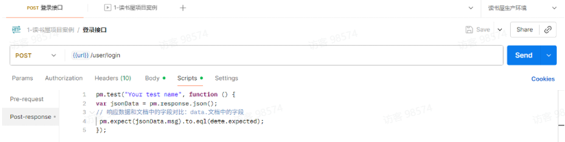 在 Scripts—Post-response 标签页中标签页中,使用数据文件中的 expected 字段来进行动态断言。
