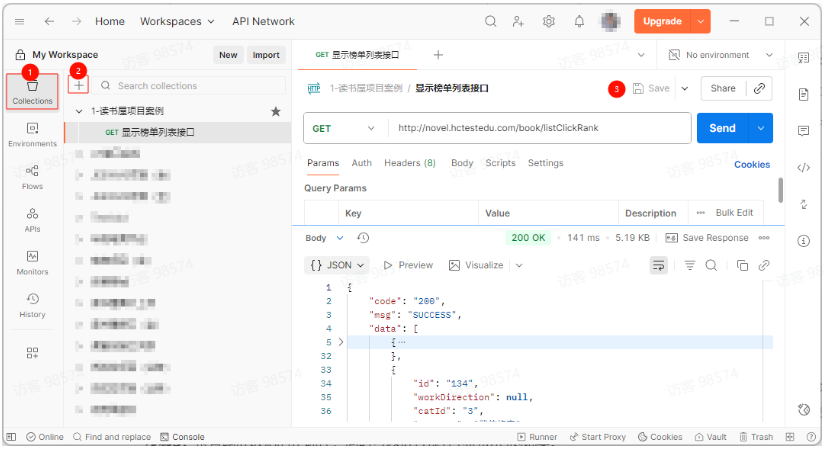 • 界面中央区域,显示当前选中的集合、请求、测试脚本等。