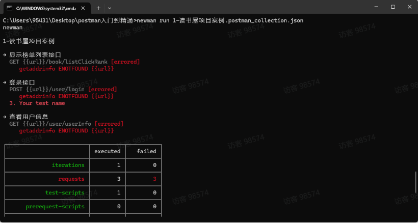 1 newman run 1-读书屋项目案例.postman_collection.json -e 读书屋生产环境.postman_environment.json -d user.csv -r html --reporter-html-export NewmanBasicReport.html