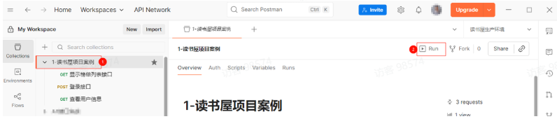 集合:点击集合右边的 ... -> Export -> 选择 Collection v2.1 格式 -> 导出为 1-读书屋生产环境.postman_collection.json。