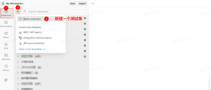 • Collections(测试集):可以维护对应的接口集合,比如:New(新建请求、集合)、Import(导入数据)、Runner(运行集合测试)