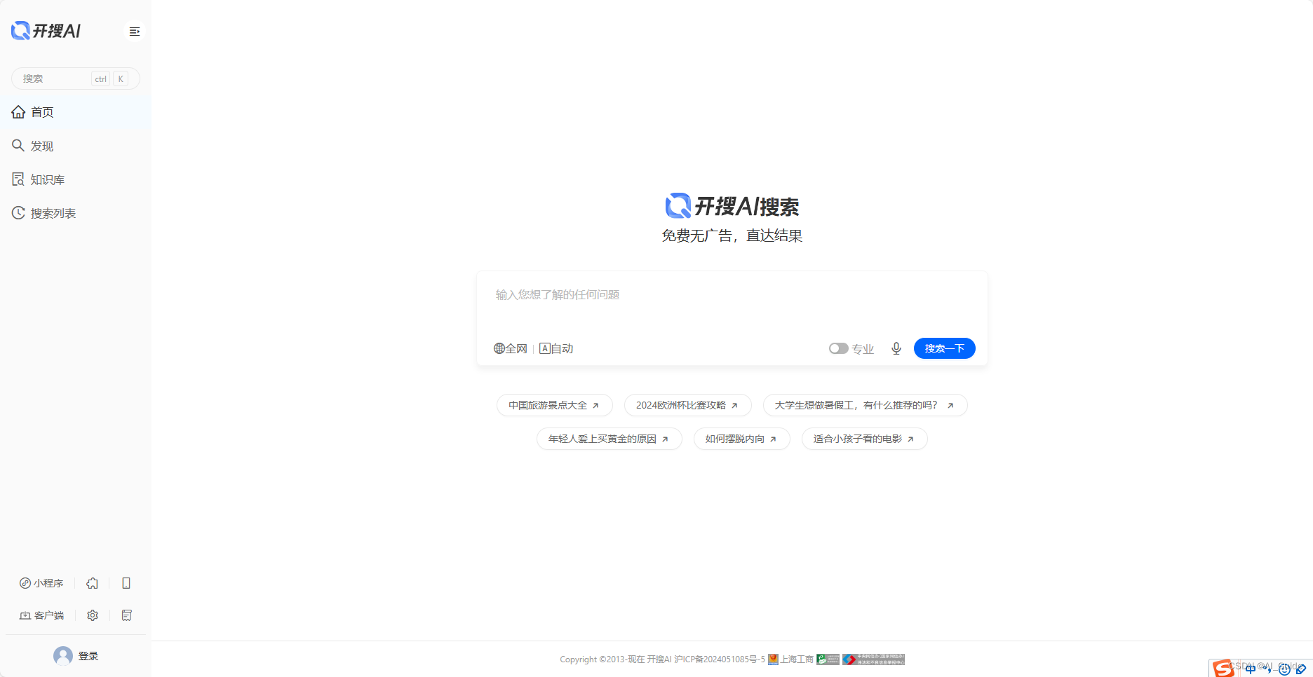 开搜AI问答搜索是一个创新的搜索工具,它专注于提供无广告的搜索体验,使用户能够直接快速地获取所需信息。以下是该搜索引擎的一些关键特性: