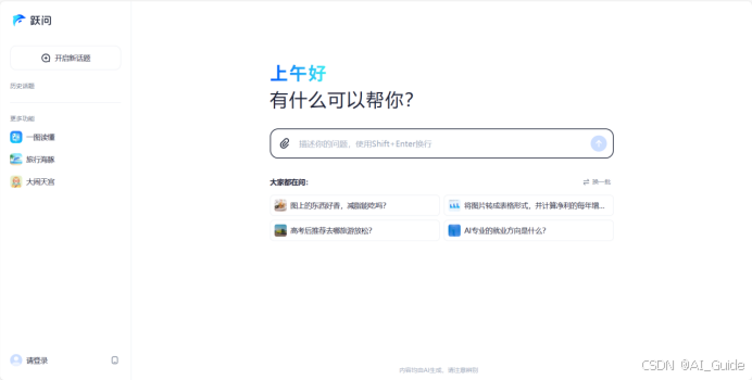 跃问以其独特的方式,将历史话题、一图读懂等丰富内容呈现给用户,让每一次提问都成为一次知识的发现之旅。无论是对个性特征的好奇,还是对行业论坛的关注,跃问都能以AI生成的内容,为你提供详尽而准确的答案。