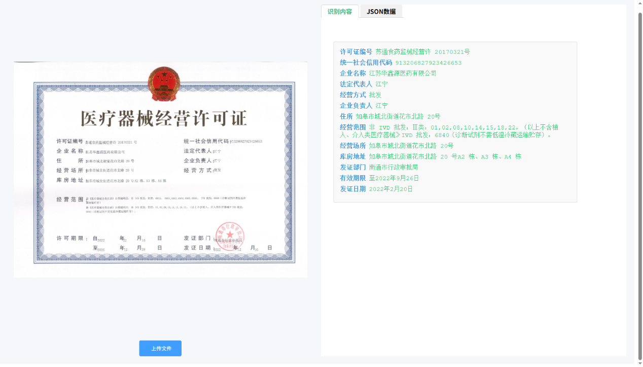 医疗器械经营许可证OCR识别是基于深度学习算法开发的一套针对医疗行业资质证件信息提取的智能化识别系统,支持医疗器械经营许可证上企业名称、统一社会信用代码、法定代表人、企业负责人、住所等等全字段的结构化提取。
