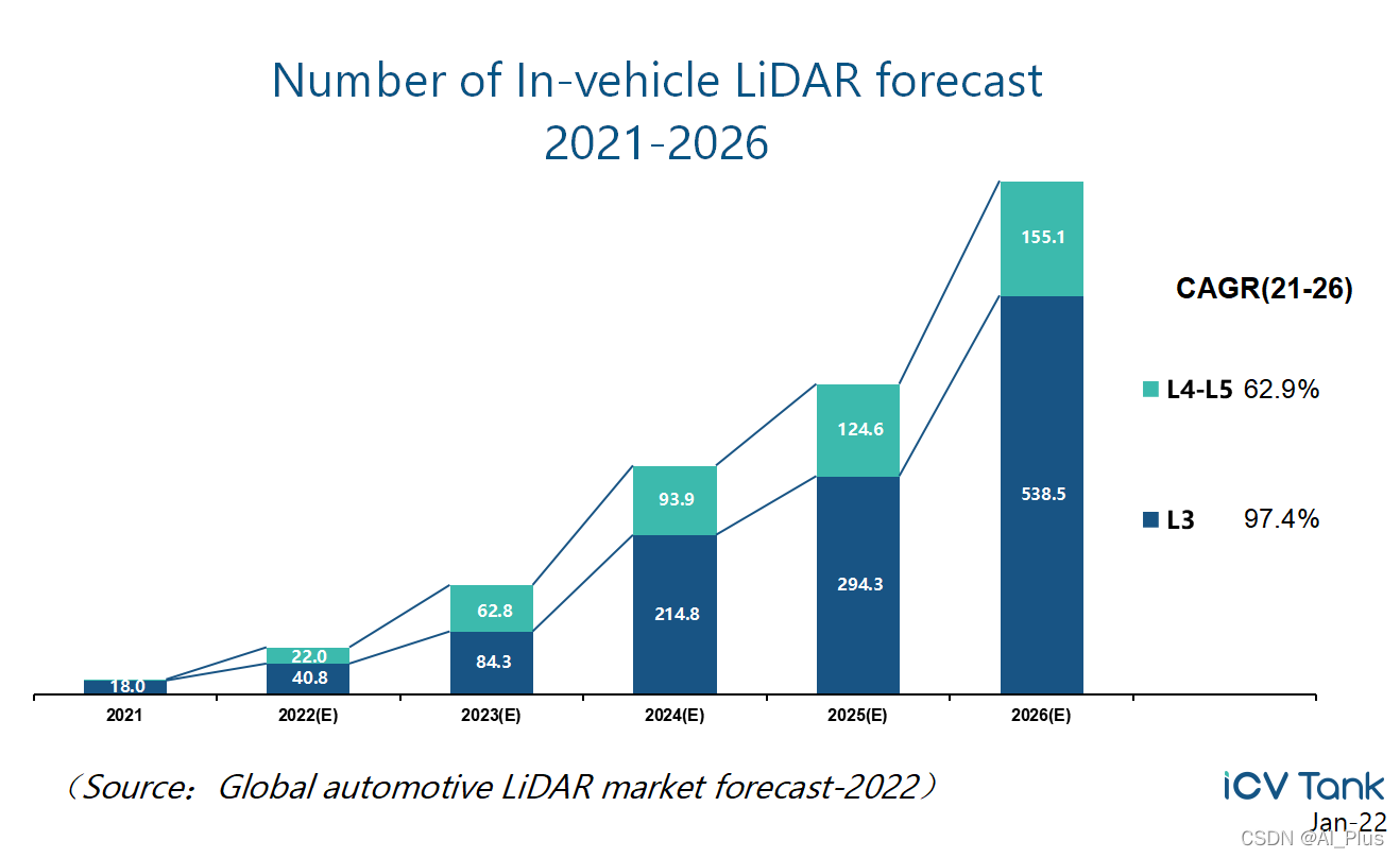 ICV预测,到2026年,全球车载激光雷达出货量将达到693.6万颗,其中L3级别和L4-L5级别搭载的出货量将分别增至538.5和155.1万颗,21-26,五年的CAGR分别为97.4%和62.9%,增长速度惊人。