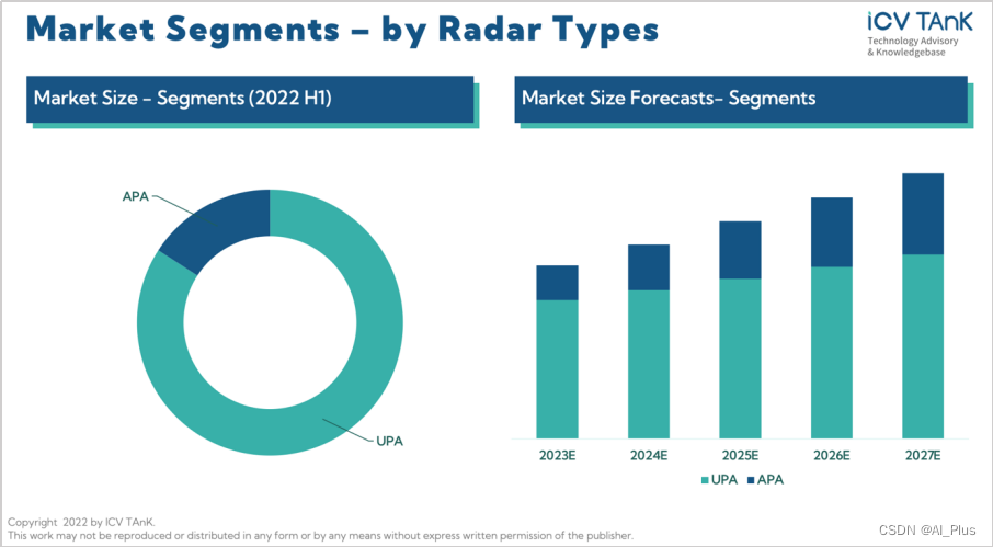 2022年上半年,车载超声波雷达市场价值约为20.4亿美元,其中渗透率超过90%的UPA雷达占到了84%,而由于目前搭载自动泊车功能的汽车数量较少,APA雷达的市场规模仅为3.23亿美元,渗透率仍有较大的上升空间。ICV的分析师认为,虽然超声波雷达的功能并不是完全不可替代的,但是其成熟的技术和便宜的价格让超声波雷达在目前的汽车自动化阶段仍是具有竞争力的。UPA雷达的市场规模预计在2023年达到37.15亿美元,未来五年的CAGR约为5.8%,整体增速较缓。而APA雷达的市场规模有望快速增长(五年CAGR约为18.6%),主要因为下游对自动泊车功能的需求上升,带动了APA雷达的销量。