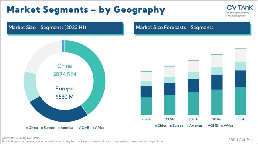 ICV将全球市场细分为中国、欧洲、美洲、亚太和中东地区以及非洲共五片区域,其中作为汽车消费大国的中国约占全球市场的40%,欧洲市场紧随其后,贡献了5.3亿美元的销量。亚太和中东地区2022年上半年的销量约为4亿美元,位居第三。美洲和非洲的销量分别是2.5亿美元和5,600万美元。在未来五年内,ICV预计这五片区域各自所占比例将不会有太大变动,中国市场和美洲市场的增速较高,而非洲市场是增长最慢的。