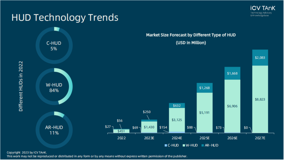 目前车载HUD产品主要有三种常见类型:C-HUD、W-HUD及AR- HUD。C-HUD的全称是Combiner-HUD,它最大的优点是成本较低,但缺点是呈像效果较差。W-HUD(Windshield-HUD)使用了更高亮度的光源,极大提升了图像清晰度和对比度,但需要配置特定的挡风玻璃导致成本较高。AR-HUD采用了最先进的AR投影技术,虚实结合,需要高算力支持,目前渗透率最低。ICV的分析师预测未来五年内W-HUD将是普及率最高的一种HUD产品,预计在2027年市场规模能够达到88.23亿美元。