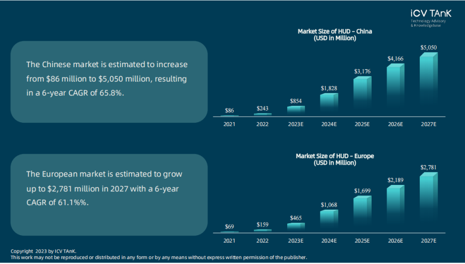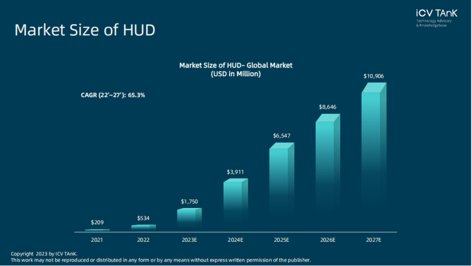 2022年HUD全球市场规模为5.34亿美元,较2021年增长约155%。随着市场渗透率逐步提升,HUD市场规模或将迎来高速增长期,预计到2027年达到109亿美元,6年期的CAGR高达65.3%。