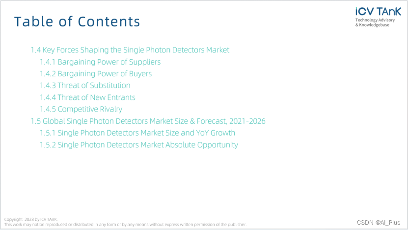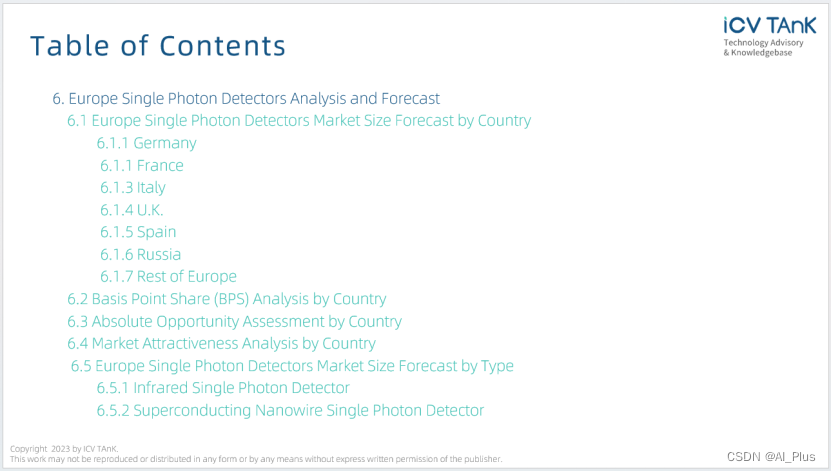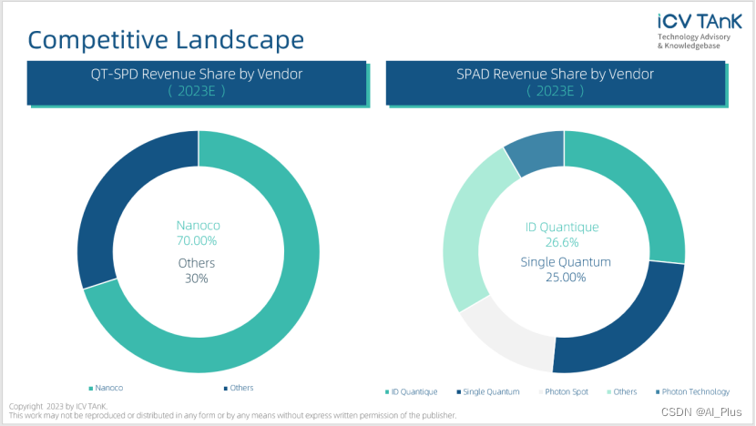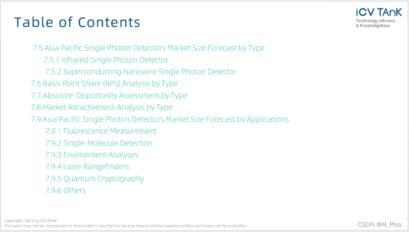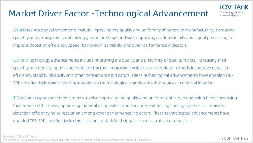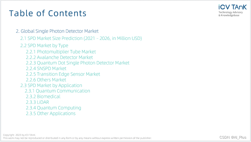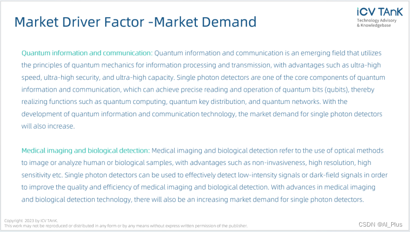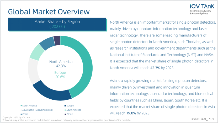 ICV发布的报告详细分析了单光子探测器市场,包括产品分类、应用领域、主要供应商和市场预测。单光子探测器在量子信息、安全激光雷达等领域有广泛应用,其中超导纳米线单光子探测器展现高性能。北美和亚洲是主要市场,中国和北美市场预计将持续增长。报告还探讨了技术进步,如SNSPD和QD-SPD在医学成像和量子通信中的潜力。