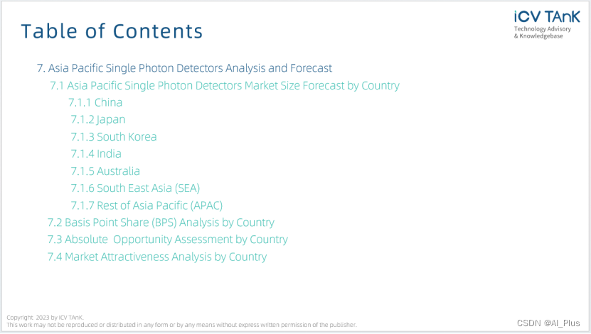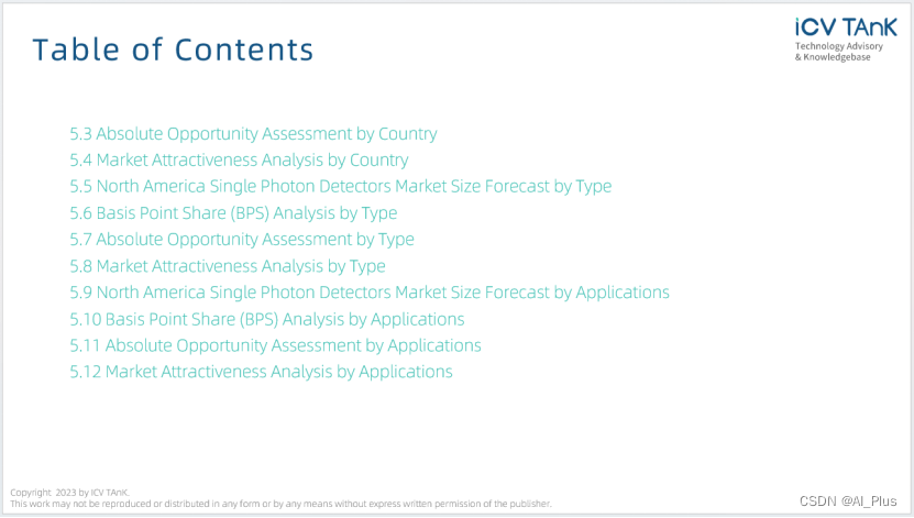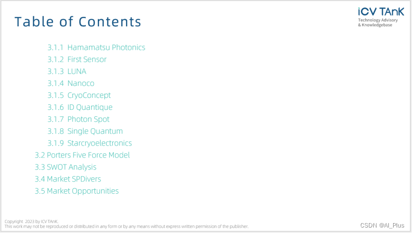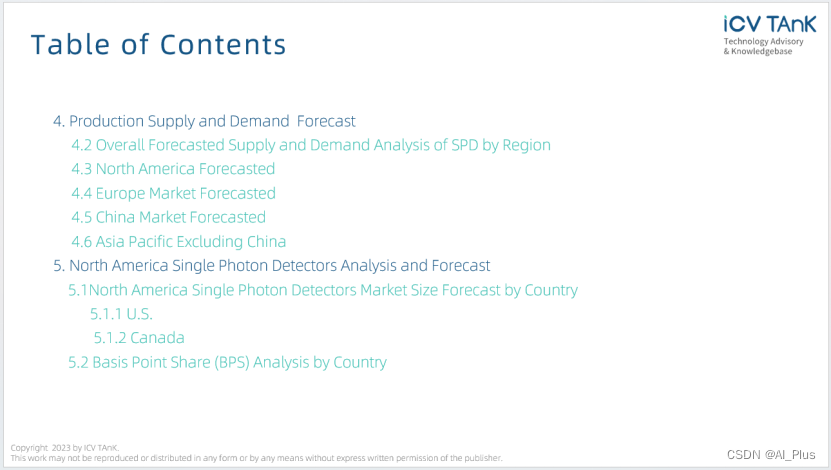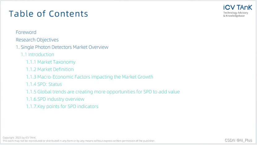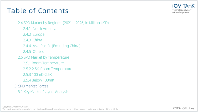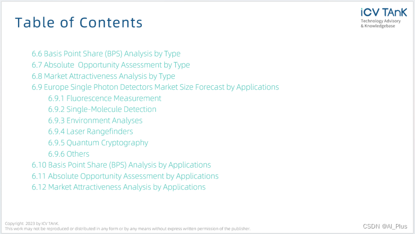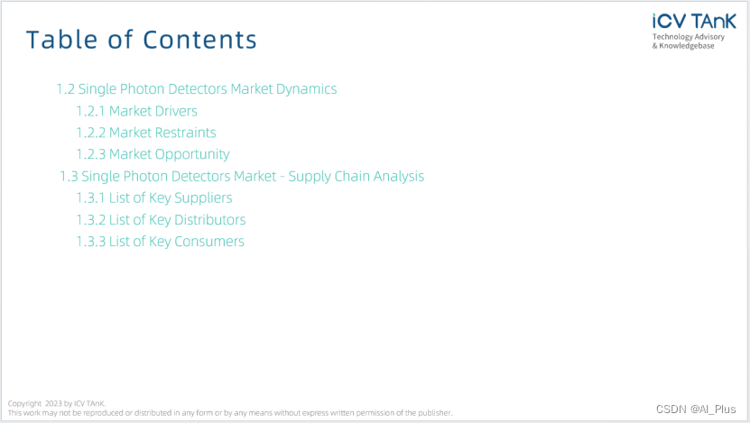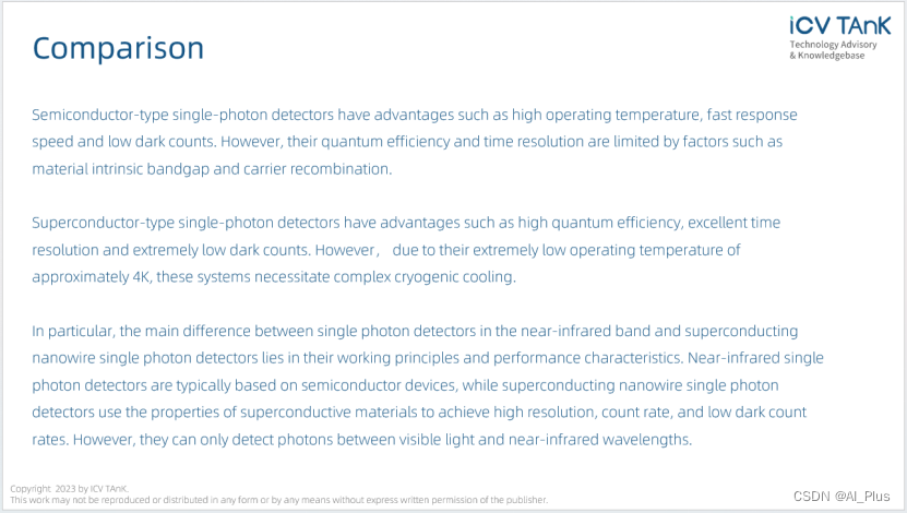 ICV发布的报告详细分析了单光子探测器市场,包括产品分类、应用领域、主要供应商和市场预测。单光子探测器在量子信息、安全激光雷达等领域有广泛应用,其中超导纳米线单光子探测器展现高性能。北美和亚洲是主要市场,中国和北美市场预计将持续增长。报告还探讨了技术进步,如SNSPD和QD-SPD在医学成像和量子通信中的潜力。