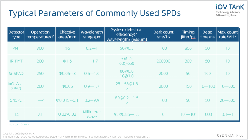 不同的单光子探测器具有不同的优缺点。该表列出了目前使用的典型SPD参数,其中一些数据来自参考文献,其他数据来自各种公司网站。从表中可以看出,基于半导体的单光子探测器主要在可见光范围内运行,在红外范围内检测效率较低,并且与超导单光子探测器相比具有更高的暗计数。