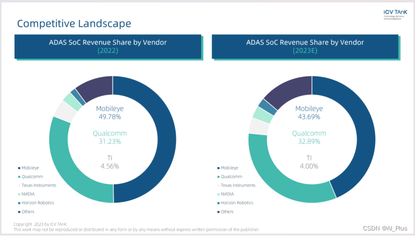 ADAS SoC市场集中度较高,Top3供应商(Mobileye,Qualcomm,TI)销量占比超八成,整个市场正经历着快速增长和激烈的竞争。像Mobileye和高通这样的知名行业巨头凭借其全面的产品组合和在半导体技术方面的广泛专业知识主导着市场。这些参与者与汽车制造商建立了强大的合作伙伴关系,使他们能够有效地进入汽车市场。