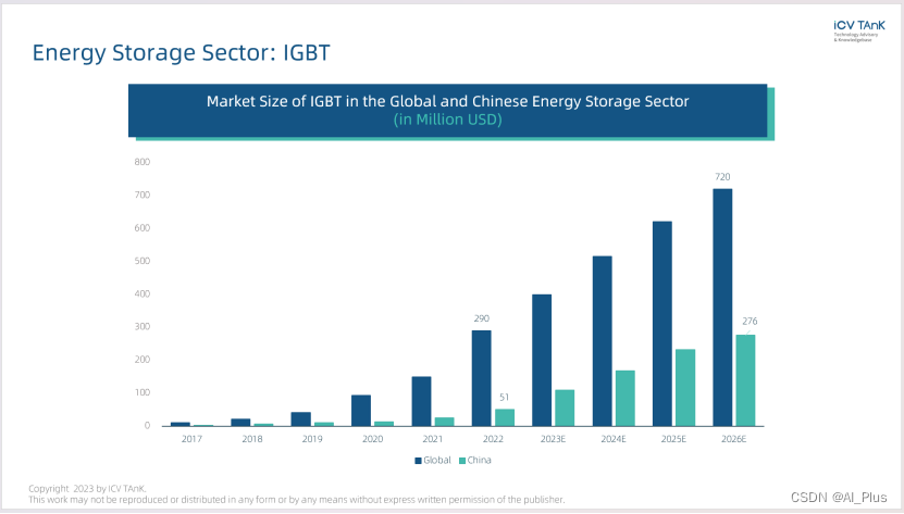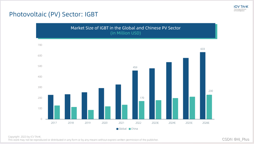 通过光伏逆变器的市场需求、单位成本,以及IGBT价值占比等综合估算,2022年全球及中国光伏逆变器领域IGBT市场需求为4.59亿美元、1.70亿美元,预计2026年全球及中国光伏领域IGBT的市场规模将达到6.33亿美元、2.30亿美元。