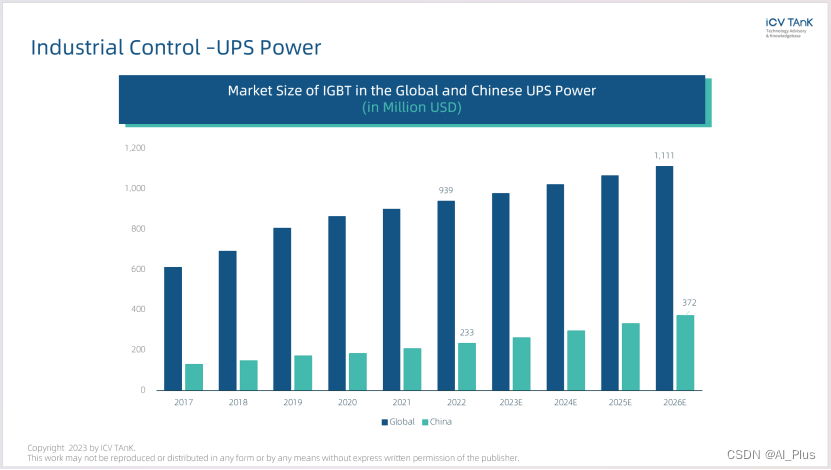 2022年全球及中国UPS电源领域的IGBT市场规模为9.39亿美元、2.33亿美元,预计到2026年,全球及中国UPS电源领域的IGBT市场规模为11.11亿美元、3.72亿美元。