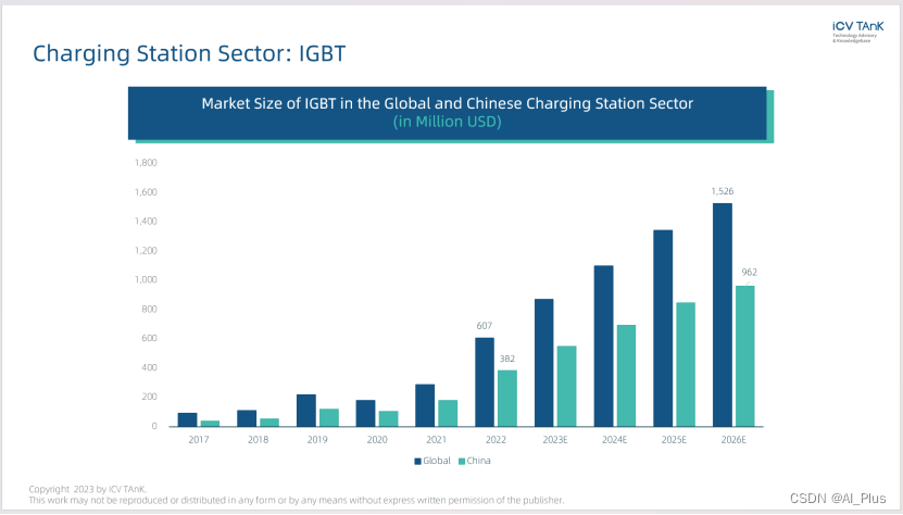 目前,全球新能源车领域功率半导体市场规模持续高增长,据统计2022年全球及中国新能源汽车领域功率器件市场规模分别为36.31亿美元、22.97亿美元,预计2026年市场规模分别为119.51亿美元、63.00亿美元。