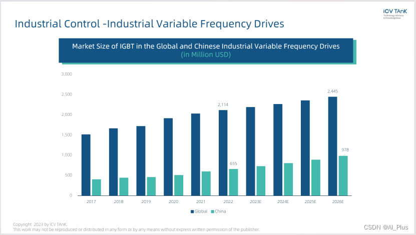 2022年全球及中国工业变频器领域的IGBT市场规模为21.14亿美元、6.55亿美元,预计到2026年,全球及中国工业变频器领域的IGBT市场规模为24.45亿美元、9.78亿美元。