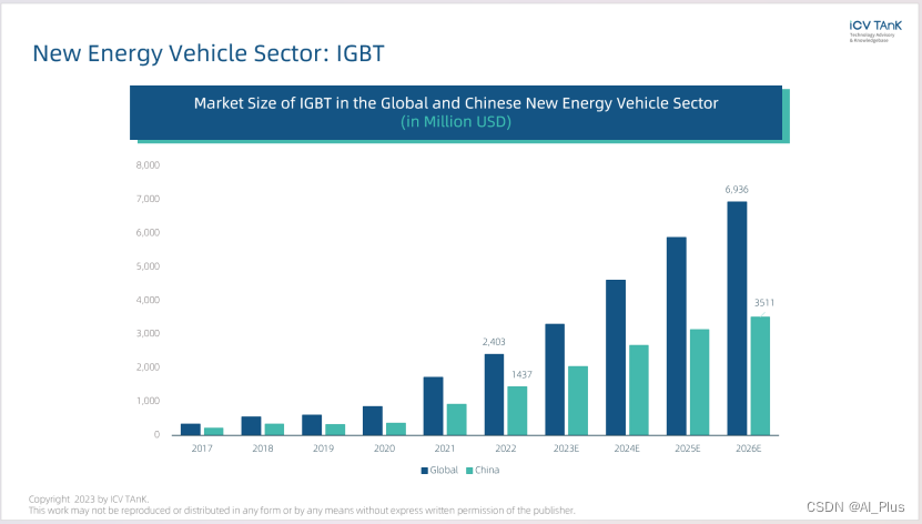 在新能源汽车快速发展的市场环境下,IGBT迎来良好的发展空间,以IGBT单车价值量为261.24美元计算,2022年全球及中国新能源汽车领域的IGBT市场规模为24.03亿美元、14.37亿美元,预计2026年可分别达到69.36亿美元、35.11亿美元。