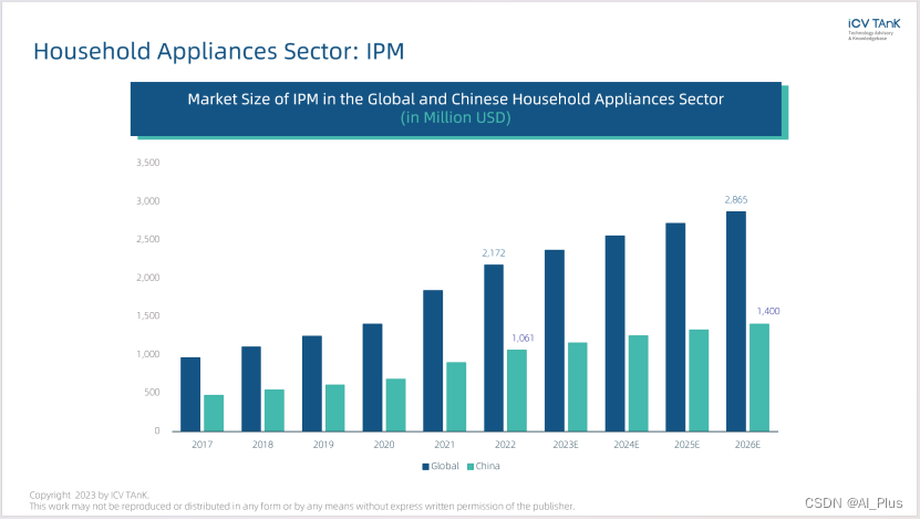 2022年全球及中国变频白色家电领域的IPM市场规模分别为21.72亿美元、10.61亿美元,预计到2026年,全球及中国变频白色家电领域的IPM市场规模为28.65亿美元、14.00亿美元。