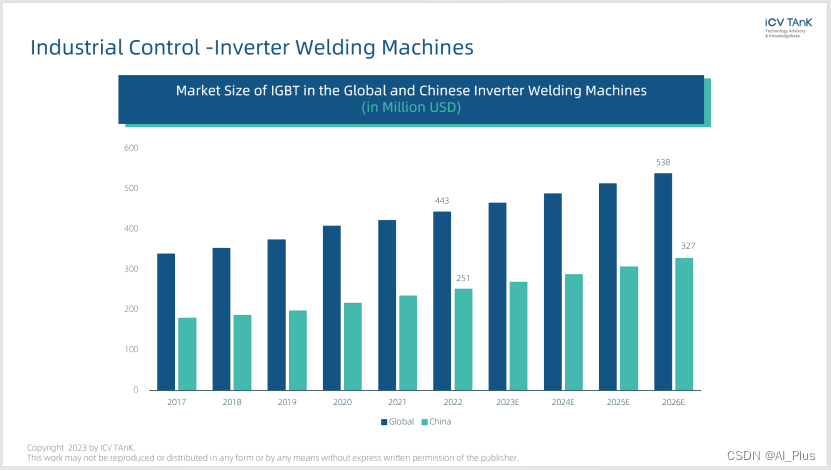 2022年全球及中国逆变焊机领域的IGBT市场规模为4.43亿美元、2.51亿美元,预计到2026年,全球及中国逆变焊机领域的IGBT市场规模为5.38亿美元、3.27亿美元。