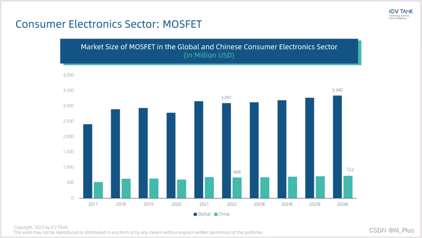 随着汽车智能化的发展,ADAS、安全和信息娱乐等功能都需要使用MOSFET,未来中高端车型的MOSFET可能会增至400个。预计2026年全球及中国的新能源汽车领域的MOSFET市场规模可达到8.07亿美元、4.09亿美元。
