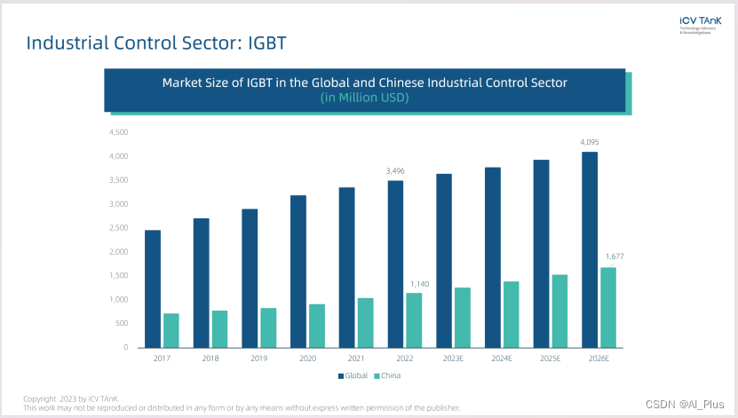 2022年全球及中国工控领域的IGBT市场规模为34.96亿美元、11.40亿美元,预计到2026年,全球及中国工控领域的IGBT市场规模为40.95亿美元、16.77亿美元。