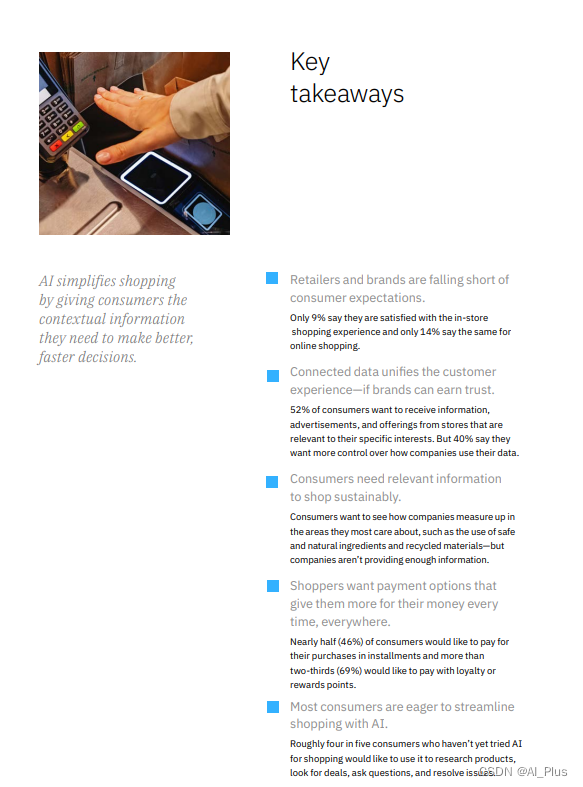 IBM的最新报告显示,全球消费者对零售体验普遍不满,尤其对中国消费者而言。尽管实体店仍受欢迎,但AI技术如虚拟助手和应用被期待改善购物体验。经济因素如通货膨胀影响购物决策,零售商需利用AI创新以满足消费者个性化需求和降低成本。