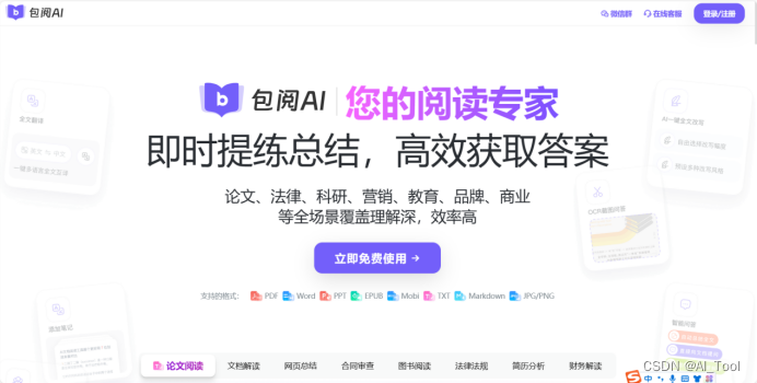 在这个日益增长的信息洪流中,我们越来越期望能有效率地攫取每篇文字、每个文件的要义。此时,包阅AI,一位领先的智能化阅读伙伴,运用其创新技术将我们的阅读过程转变为一段更迅捷、更深化的体验。 无论你需要处理的是学术报告、法律文件,还是金融报告、商业策划,包阅AI都能即时生成关键内容的概要,助你快速捕捉重点,节省大量时间。它的能力不仅表现在处理文本内容上,还延展到了音频和视频资料,实现了全方位的多媒体阅读支持。 利用包阅AI,你可轻松上传各种文件,立即得到细致的解析和关键点注释。无论是检查合同还是评估简历,它都能从专业角度提供深刻见解,使你的决策更具智慧。 在当今信息过载的世界,包阅AI宛如阅读之路上的一盏指引灯,让我们在探寻知识的过程中能够游刃有余。它超越了一款应用程序的界限,更像一位同行的伙伴,伴随我们走向更深更广的阅读领域。 若你也在寻求一位能提高阅读效力与理解深度的智能化助手,包阅AI会是一个理想的解决方案。在AIGC.cn,你将了解到更多包阅AI所提供的智能服务及应用场景,让我们携手步入智能化阅读的新纪元。
