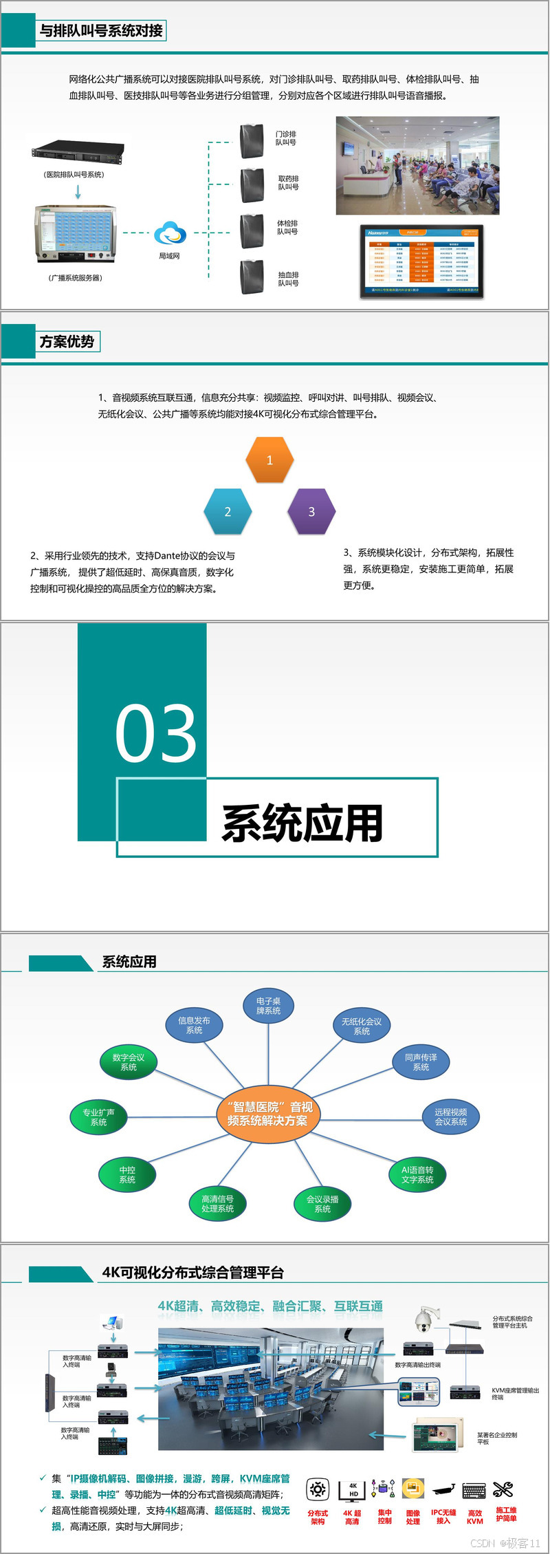 方案的优势显著。音视频系统互联互通,各系统均能对接 4K 可视化分布式综合管理平台,实现信息充分共享。采用行业领先技术,支持 Dante 协议的会议与广播系统,提供高品质的音频解决方案,具备超低延时、高保真音质和数字化控制等特点。系统模块化设计和分布式架构,使其拓展性强、稳定性高,安装施工也更为简单方便。