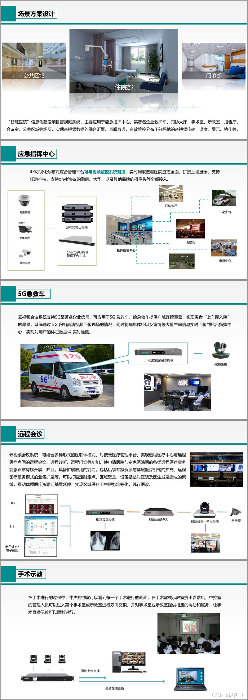 场景方案设计涵盖了医院的多个关键区域。应急指挥中心借助 4K 可视化分布式综合管理平台,与视频监控系统对接,可实时调取监控画面并拼接上墙显示,支持多种品牌摄像头接入,为应急决策提供了有力支持。5G 急救车配备云视频会议系统,利用 5G 网络实现高清视频回传和病患体征信息实时传输,让患者 “上车即入院” 成为可能。远程会诊通过云视频会议系统对接云医疗管理平台,打破了地域限制,实现远程医疗业务的开展,推动优质医疗资源下沉。