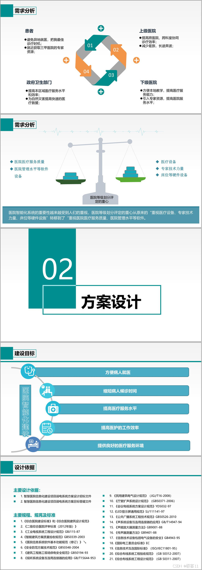 该方案的设计目标旨在打造智能化医院,以方便病人就医、缩短候诊时间、提高医疗服务水平和医护工作效率,并提供良好的医疗服务环境。在设计过程中,严格遵循了一系列规程、规范及标准,如《综合医院建设标准》《智能建筑方案质量验收规范》等,确保方案的科学性和规范性。