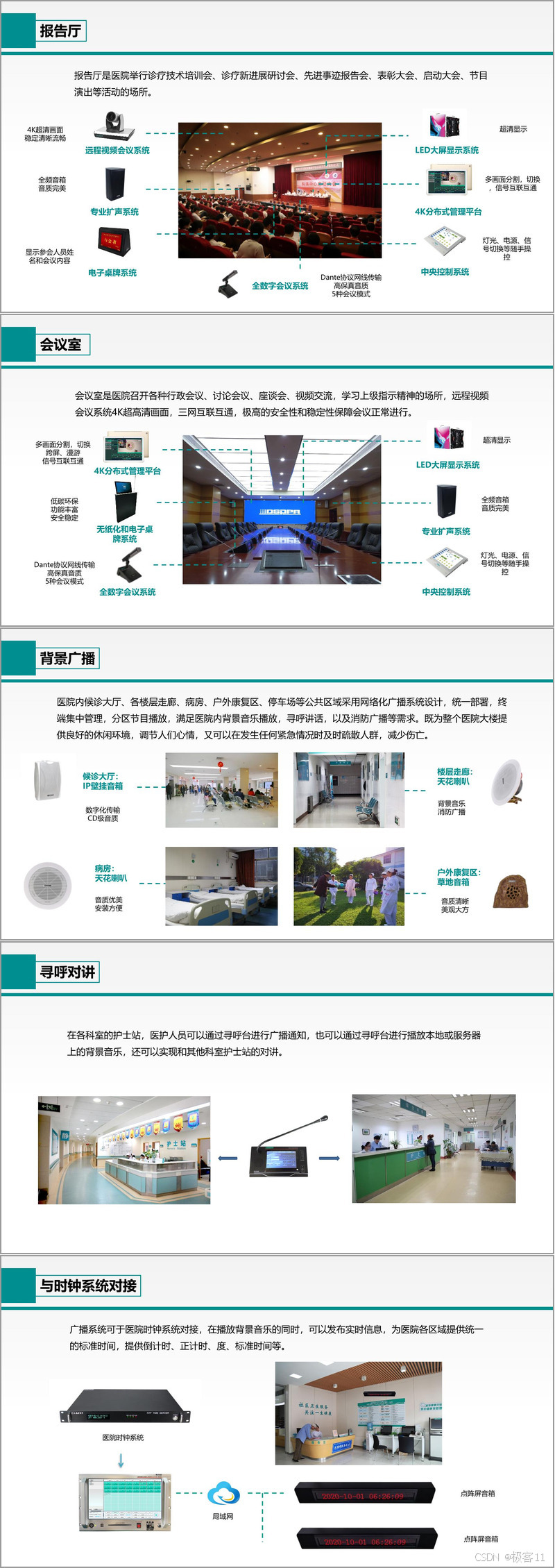 公共区域的背景广播系统采用网络化设计,通过 IP 壁挂音箱、天花喇叭等终端设备,实现分区节目播放,既能播放背景音乐,又能在紧急情况下进行消防广播和寻呼讲话。寻呼对讲系统方便了医护人员之间的沟通,还能与时钟系统和排队叫号系统对接,实现统一的时间发布和排队叫号语音播报。