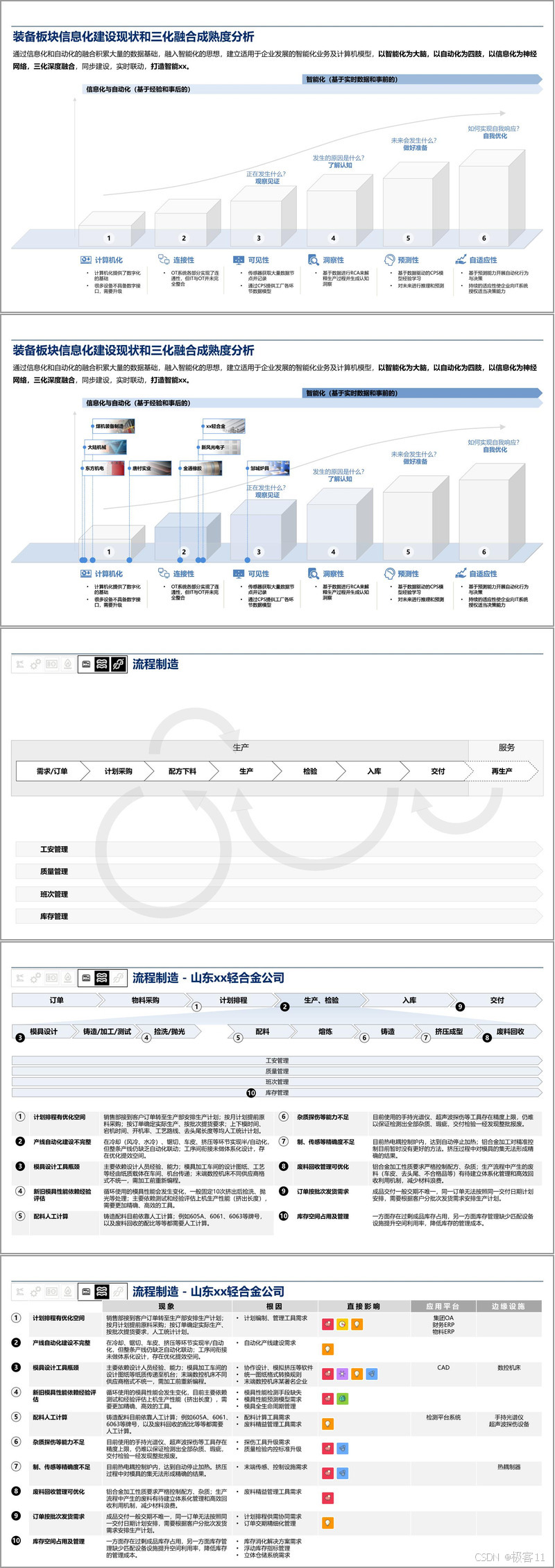 从调研访谈结果来看,企业在生产过程中存在诸多痛点,如计划排程优化空间大、自动化产线建设不完整、模具设计工具瓶颈、质量检测手段不足等。针对这些痛点,规划提出了相应的解决方案,如引入高级计划排程模块、推进自动化产线建设、开发协作设计平台、升级质量检测设备等。