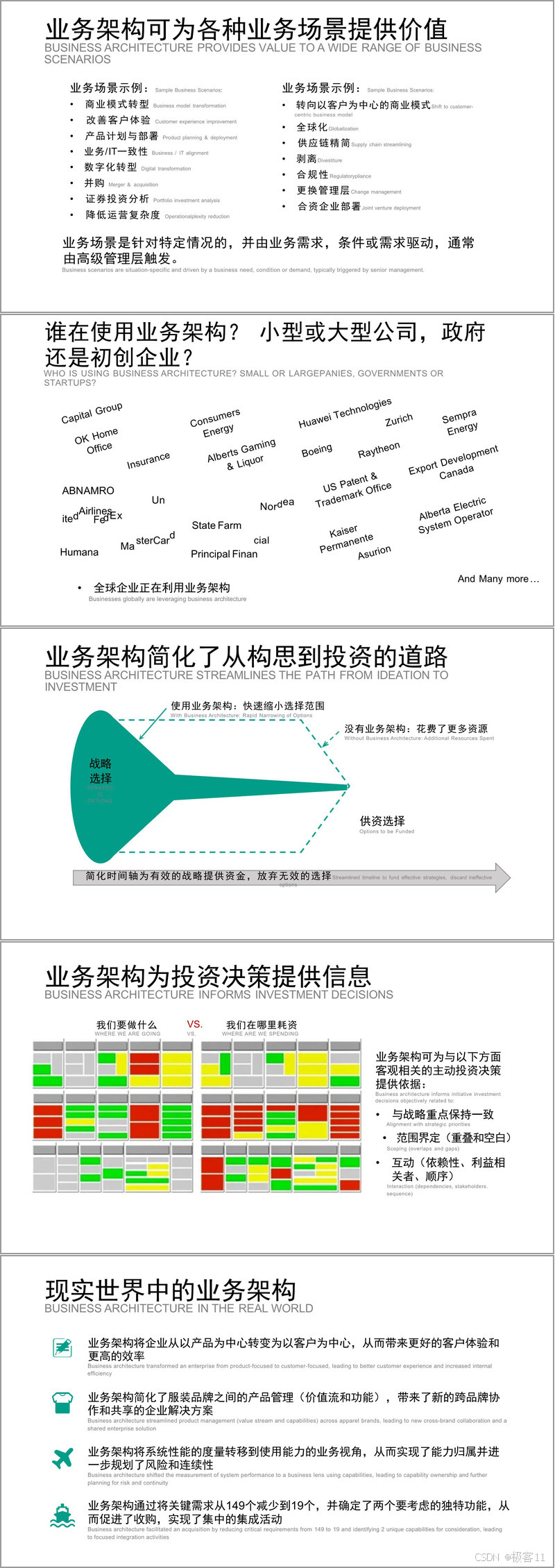 全球众多企业已充分认识到业务架构的价值并积极应用。例如,部分企业借助业务架构实现了从以产品为中心到以客户为中心的转变,显著提升了客户体验和内部效率;有的企业通过业务架构简化了产品管理,促进了跨品牌协作;还有企业利用业务架构优化了系统性能度量,进一步规划风险和连续性。在企业收购活动中,业务架构也能助力减少关键需求数量,明确独特功能,推动集中集成活动。