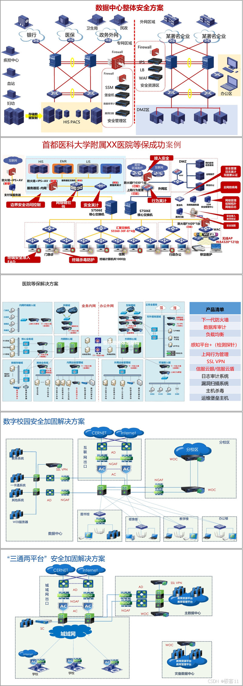在高校和企业中,网络安全的需求更为复杂。通过部署下一代防火墙、安全感知平台、数据库审计等设备,可以构建一个多层次的安全防护体系。同时,还需要考虑多校区的安全管理和应急响应机制,确保网络的安全性和稳定性。