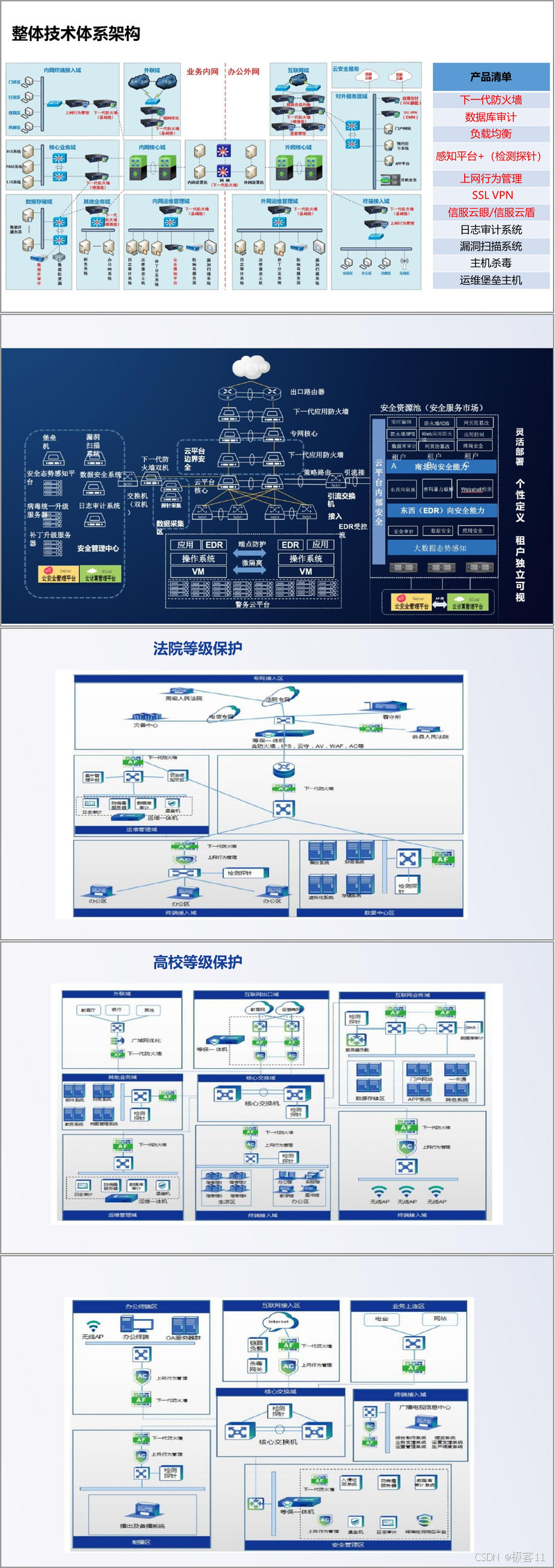 在构建技术体系时,首先需要考虑的是产品清单。常见的网络安全产品包括下一代防火墙、数据库审计、负载均衡、感知平台、上网行为管理、SSL VPN、日志审计系统、漏洞扫描系统、主机杀毒、运维堡垒主机等。这些产品在不同的安全场景中发挥着重要作用,共同构成了一个多层次的安全防护体系。