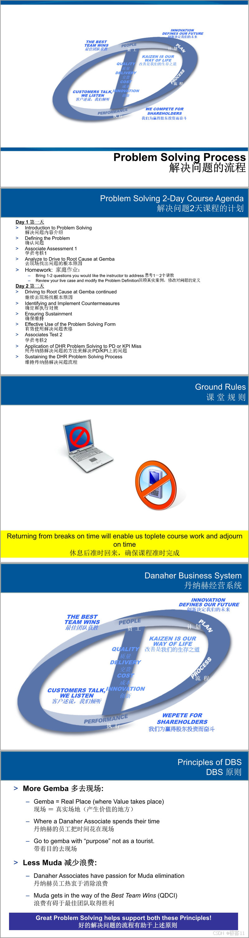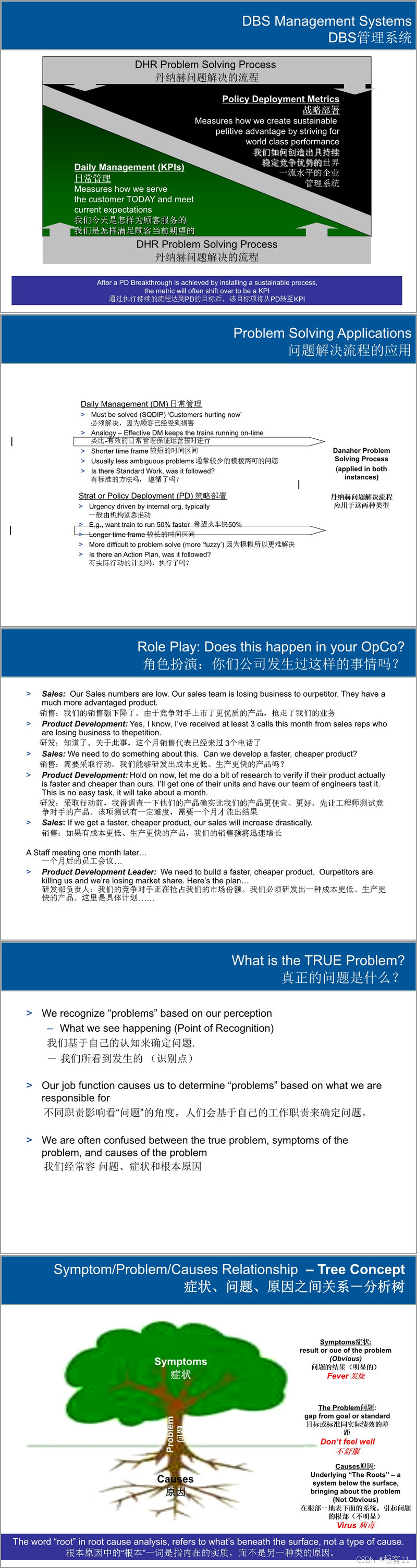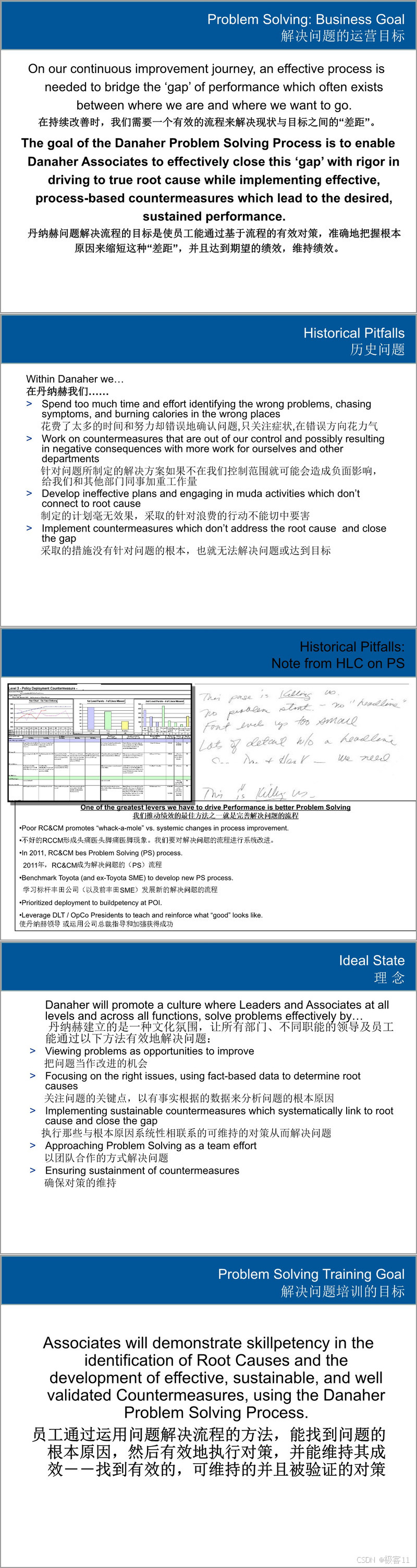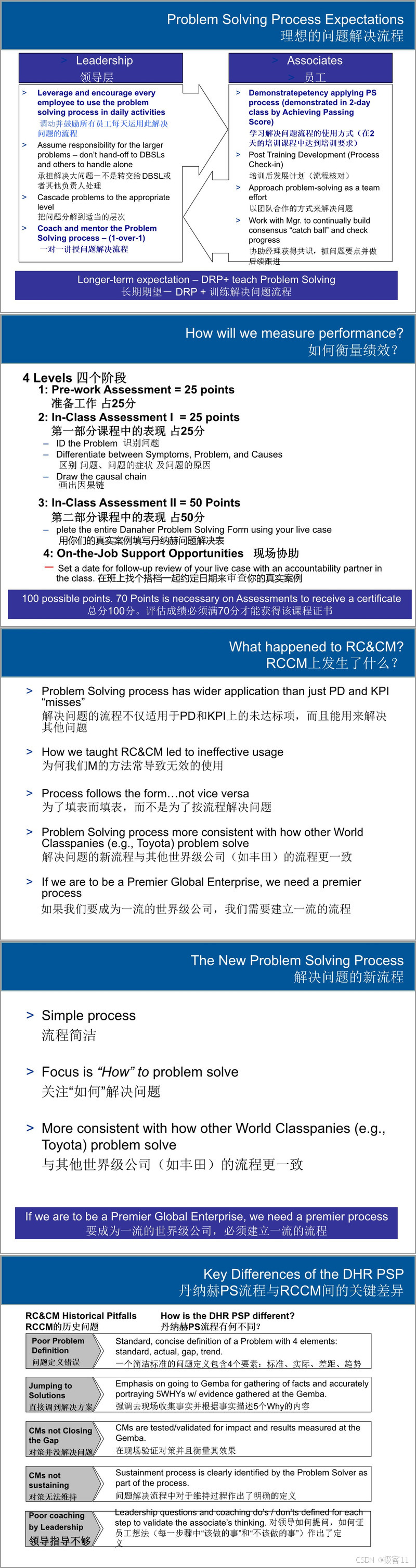 培训回顾了丹纳赫在问题解决方面的历史教训,包括:花费过多时间识别错误问题、制定超出控制范围的对策、开展无效的改进活动以及实施不针对根本原因的对策等。这些教训促成了当前问题解决流程的优化。