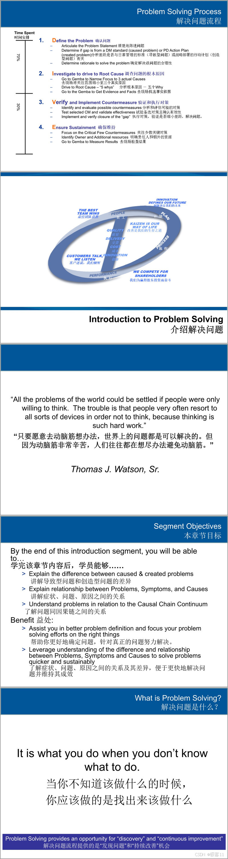- 定义问题(占70%时间):明确问题陈述,区分导致型问题(Caused Problem)和创造型问题(Created Problem),确定解决问题的合理性。这一阶段要求清晰界定目标/标准、现状、差距和趋势四个要素。