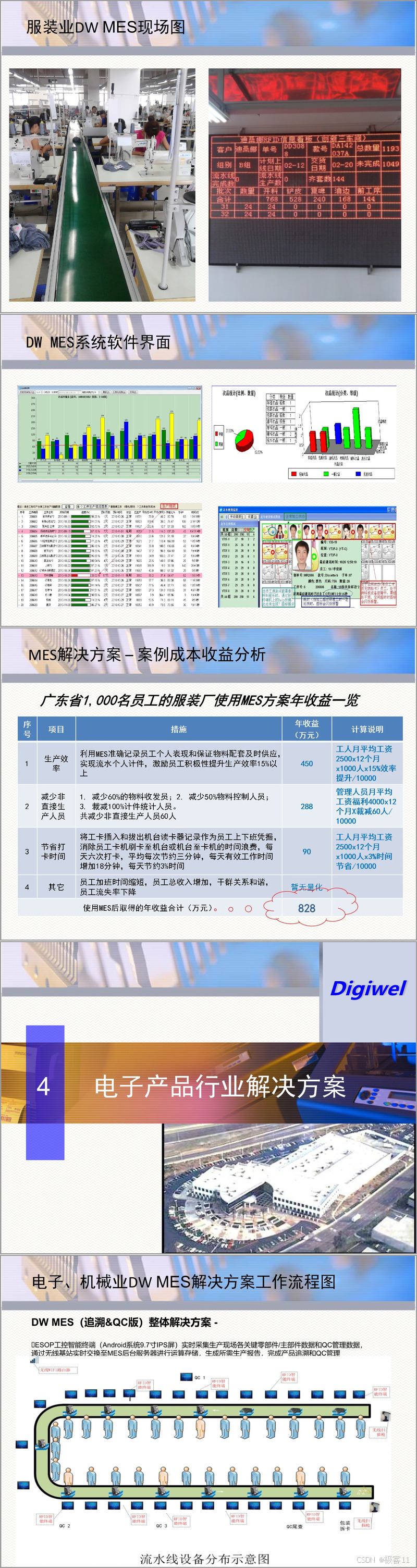 - 年收益:828万元,主要来自生产效率提升15%、裁减60名非生产人员。