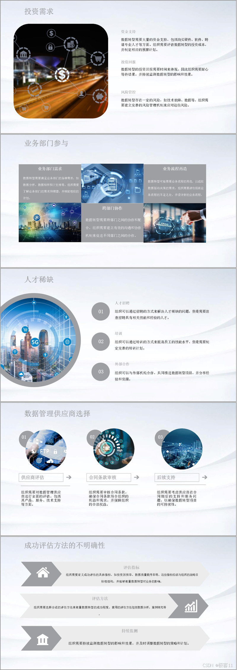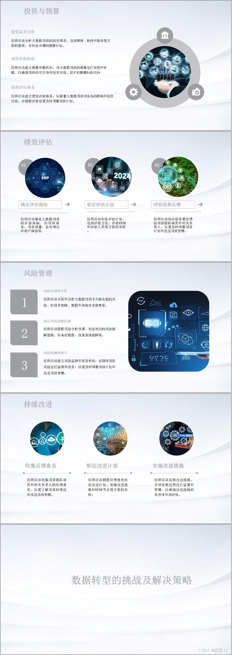 数据转型面临诸多挑战,如资金支持、投资回报周期长、风险管控、业务部门参与、人才稀缺和数据管理供应商选择等问题。对此,组织需评估投资成本,制定预算计划,耐心等待投资回报并持续监测效果;建立风险管理机制应对风险;了解业务部门需求,推动业务流程再造,加强跨部门协作,也可与外部机构合作;通过招聘和培训解决人才问题;全面评估数据管理供应商,审核合同条款并关注后续支持,持续监测数据转型效果,明确评估指标和方法。