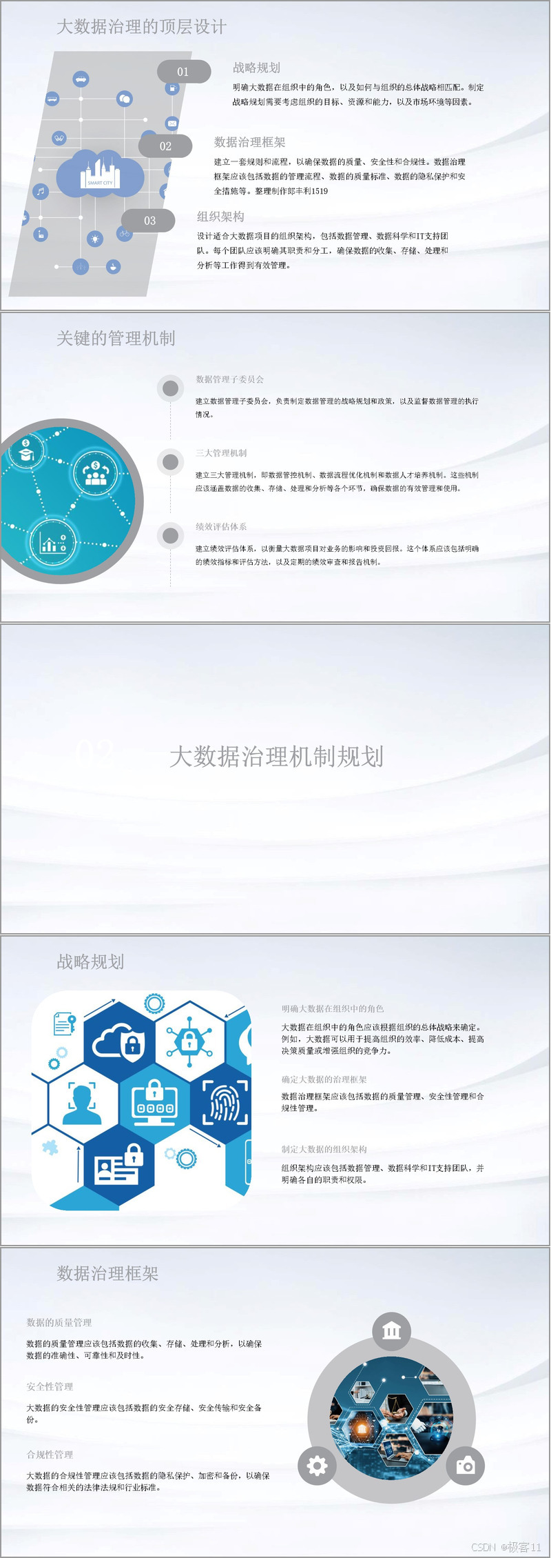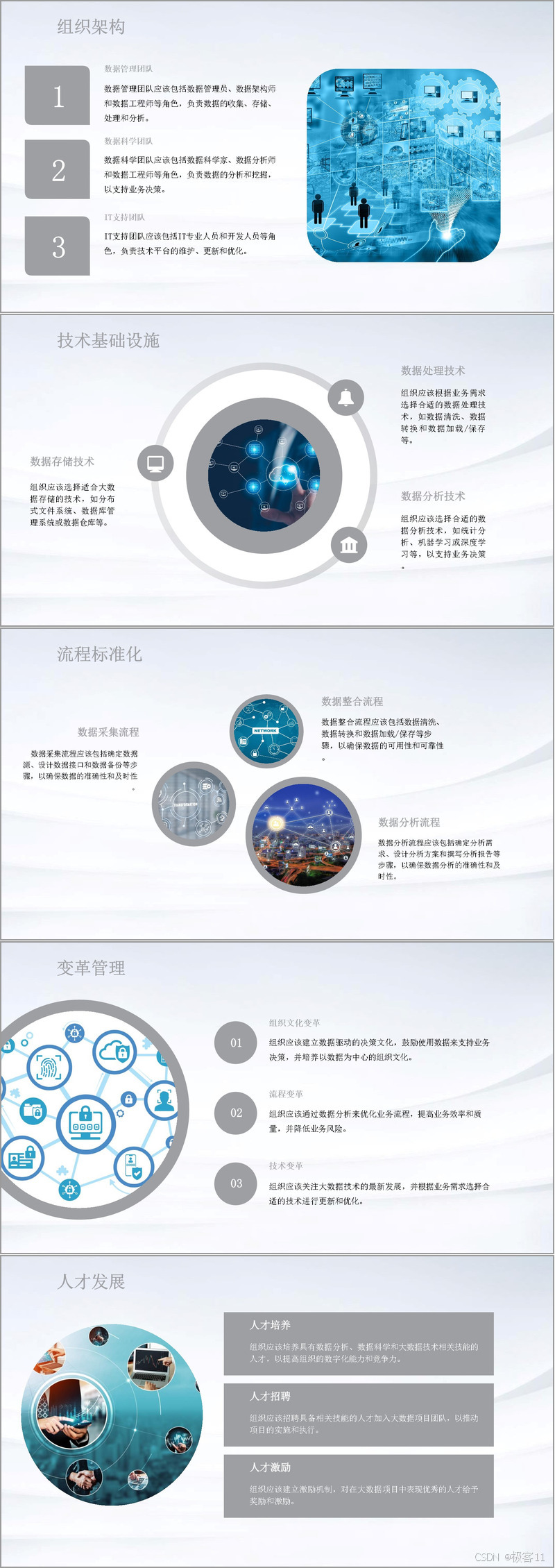 大数据治理机制规划是方案的重点内容。确定大数据在组织中的角色,其可用于提升效率、降低成本、提高决策质量或增强竞争力。建立全面的数据治理框架,包括数据的质量管理、安全性管理和合规性管理。质量管理涉及数据全流程的准确性、可靠性和及时性保障;安全性管理涵盖数据存储、传输和备份的安全;合规性管理确保数据符合法律法规和行业标准。合理规划组织架构,明确数据管理、数据科学和 IT 支持团队的职责与权限,各团队协同完成数据处理分析工作。此外,还需选择合适的技术基础设施,包括数据存储、处理和分析技术,同时标准化数据采集、整合和分析流程。在变革管理方面,组织要关注技术变革,紧跟大数据技术发展趋势;推动组织文化变革,建立数据驱动决策文化;优化流程变革,通过数据分析提升业务效率;加强人才培养、招聘和激励,提升组织数字化能力。同时,做好投资需求分析、预算审批、绩效评估以及风险管理和持续改进工作。