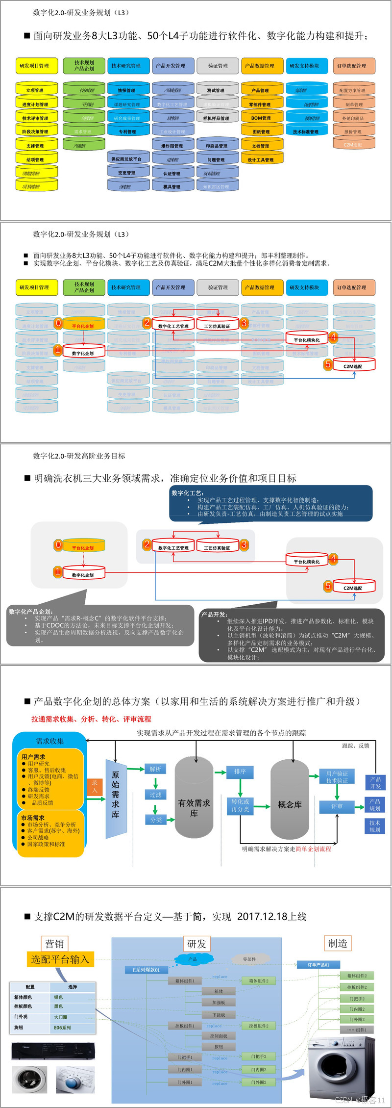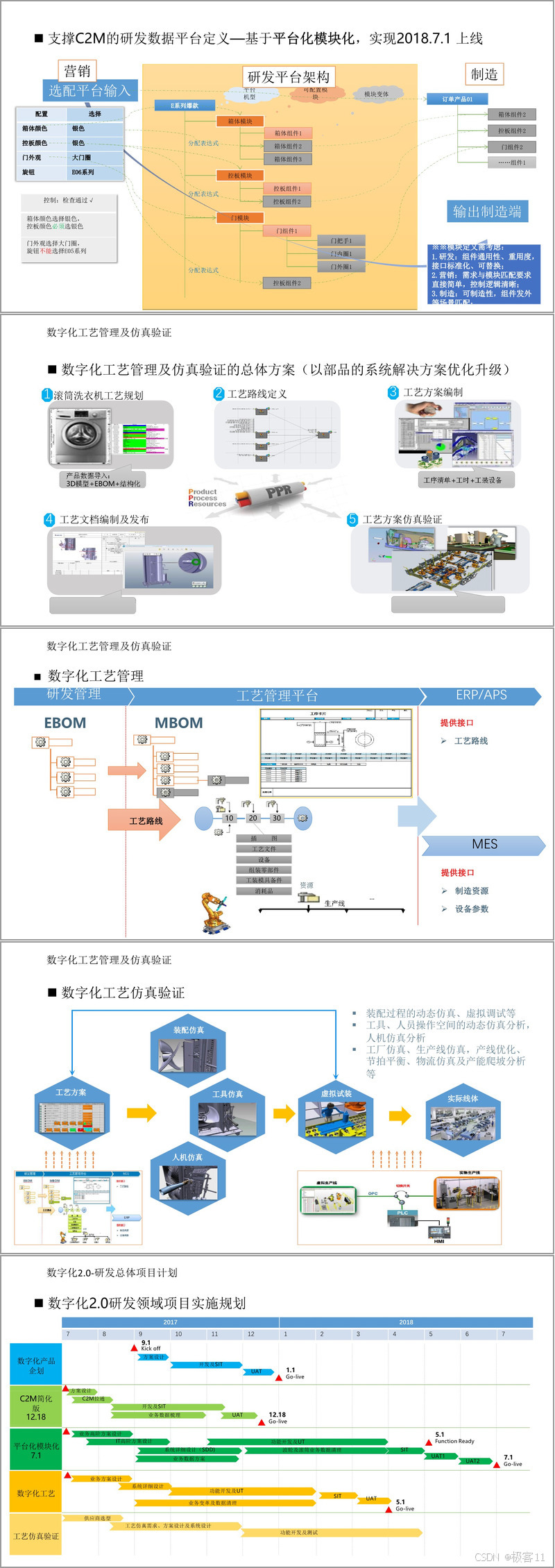 研发领域聚焦于 8 大 L3 功能和 50 个 L4 子功能的软件化、数字化能力构建。通过数字化企划、平台化模块、数字化工艺及仿真验证,满足 C2M 大批量个性化多样化的消费者定制需求。推进 IPD 开发,实现产品参数化、标准化、模块化及平台化设计,以主销机型为试点推动 C2M 业务模式,打造支撑 C2M 的研发数据平台。数字化工艺管理及仿真验证涵盖产品工艺过程管理、装配仿真、工具仿真、人机仿真等多个方面,有效提升产品研发质量和效率。