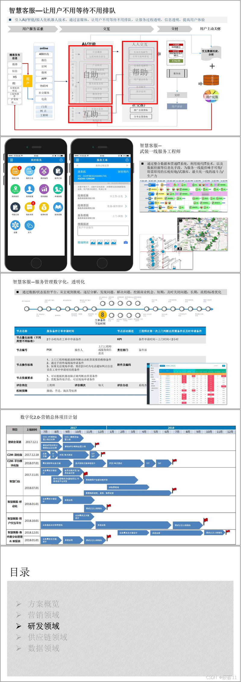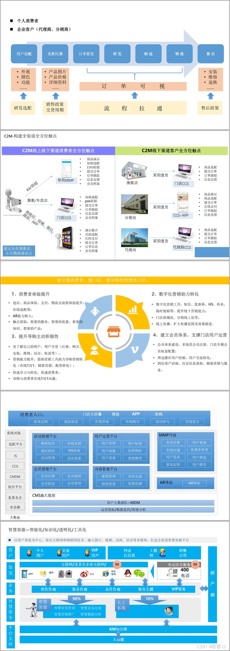 该项目以构建 C2M 能力和深化 T+3 模式为核心目标,致力于在营销、研发、供应链和数据等多个关键领域实现突破。在营销领域,项目涵盖了从总部到代理商、分销商、门店、导购、用户的全流程,通过客户产品定制化和数字化手段指导营销及服务,整合电商、物流、售后、金融等环节,全面提升消费者体验。借助数字化营销工具,如短信、优惠券、H5、秒杀、限时抢购等,门店实现商城化、分销线上化,有效提升线下营销能力。同时,建立会员体系,深入挖掘周边潜在用户,实现精准营销与服务,打造智慧化门店。智慧客服平台的搭建,更是以用户体验为中心,融合多媒体技术,引入 AI 机器人,实现服务智能化、透明化,大幅提升服务效率和质量。