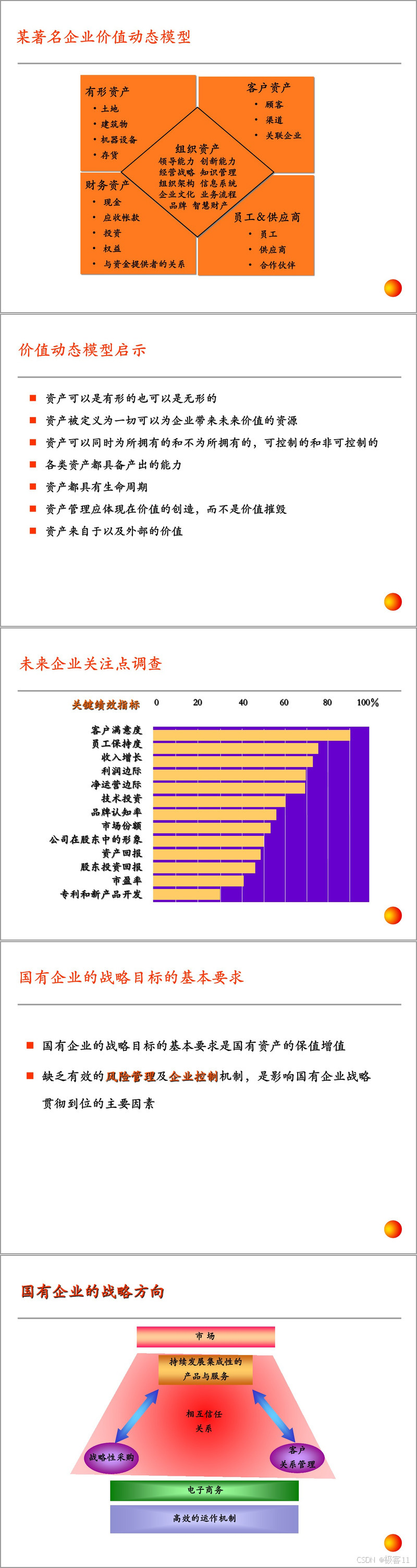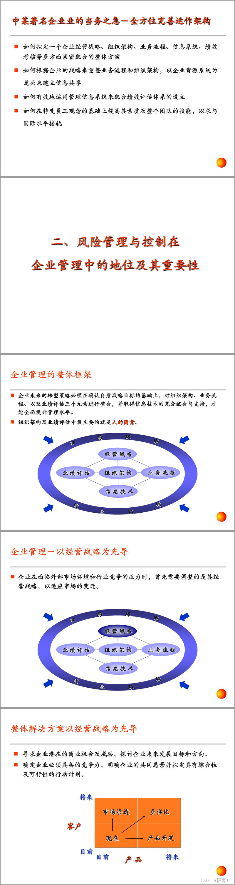 接着阐述了风险管理与控制在企业管理中的地位和重要性。企业管理的整体框架以经营战略为先导,需整合组织架构、业务流程、业绩评估,并借助信息技术支持。国有企业的战略目标是国有资产保值增值,有效的风险管理和控制机制是实现这一目标的关键。企业战略经营架构涵盖战略形成、执行、评估和控制等环节,能帮助企业明确方向、应对挑战。