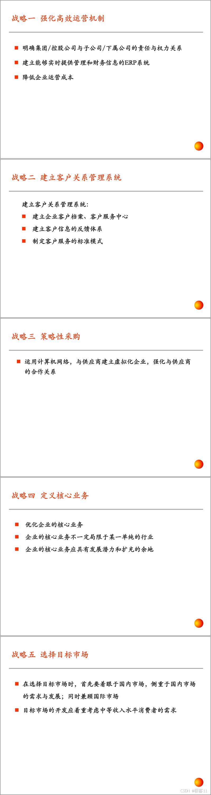 控制与业务流程重组也是重要板块。控制是企业为控制经营风险、实现经营目标而制定的政策与程序,COSO 报告指出其整体架构由控制环境、风险评估、控制活动、信息与沟通、监督五项要素构成。控制程序有多种类型,设计需遵循相互牵制、协调配合等原则,同时也存在管理人员滥用职权、人员串通作弊等局限。业务流程重组是企业实现经营战略的关键,当出现市场份额下降、交货期延长等警号时,企业需进行重组。重组以客户为导向,能提升效率、质量,增强成本竞争力和防范风险。