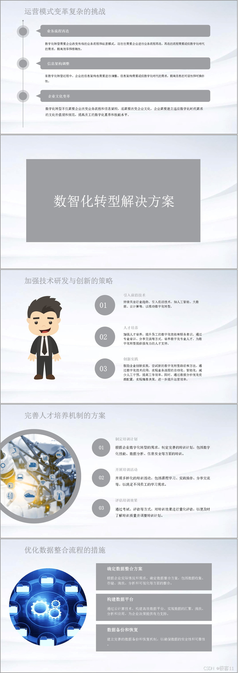 面对重重挑战,企业需要明确转型解决方案。持续引入前沿技术,如人工智能、大数据、云计算等,为转型提供技术支撑。加强人才培养,制定完善培训计划,开展多样化培训活动,并评估培训效果,培养数字化专业人才。鼓励创新实践,尝试新的转型路径和方法,实现业务流程自动化、智能化,提升运营效率。优化数据整合流程,确定数据整合方案,构建数据平台,建立数据备份和恢复机制。推动运营模式创新,创新业务流程、服务模式和组织结构。