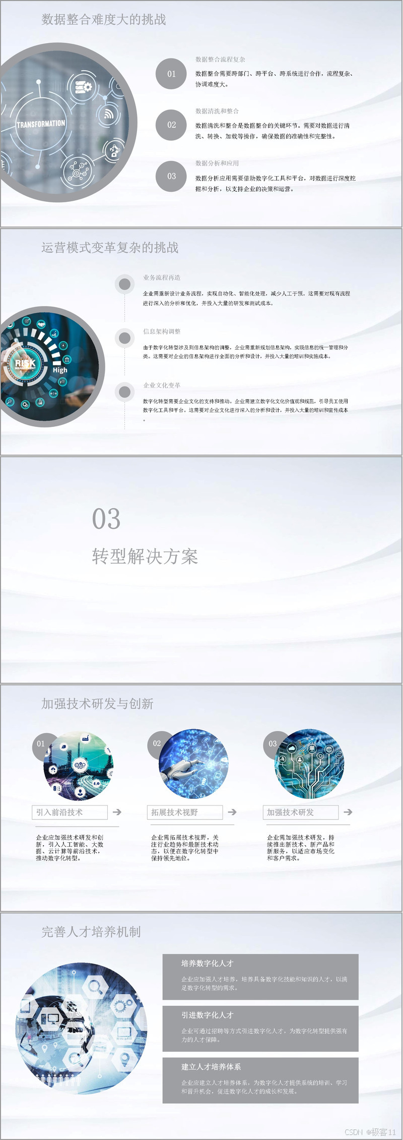 面对这些挑战,企业需采取一系列转型解决方案。技术层面,要加强研发创新,引入前沿技术,拓展技术视野,紧跟行业趋势。人才培养上,既需内部培养,提升员工数字化技能,也可外部招聘数字化人才,并建立完善的人才培养体系。数据资源管理至关重要,整合内外部数据,构建数据平台,强化数据安全。业务模式要不断创新,优化业务流程,推进数字化转型。