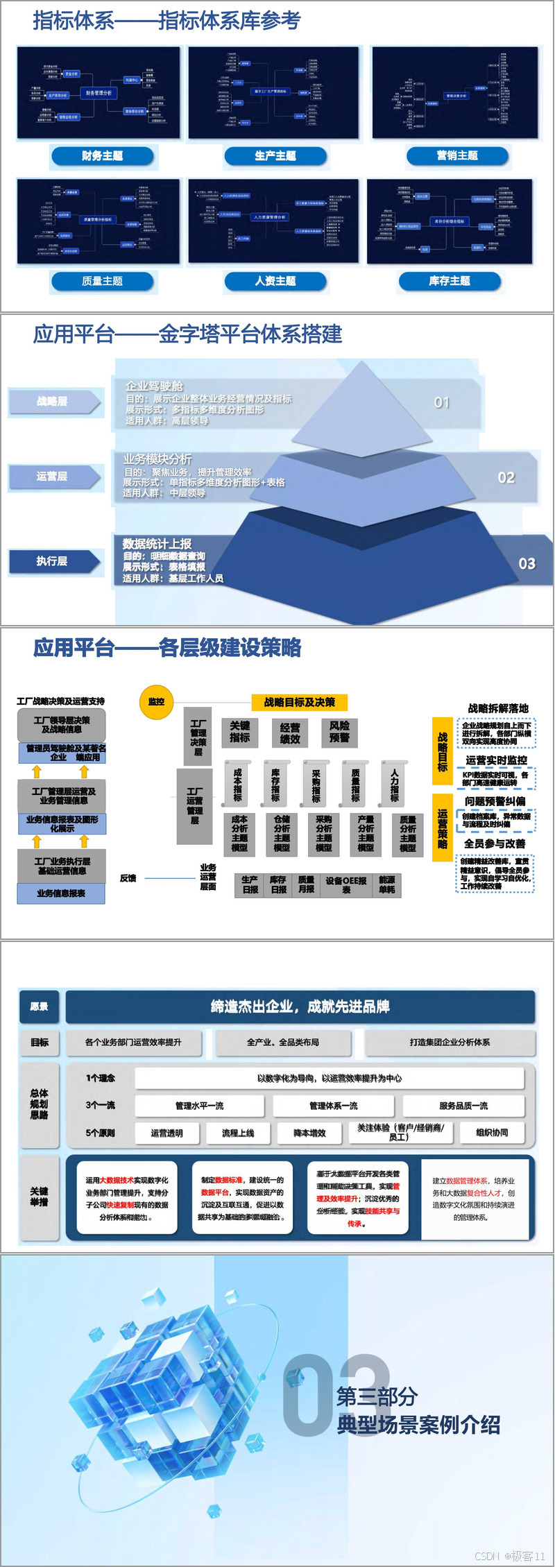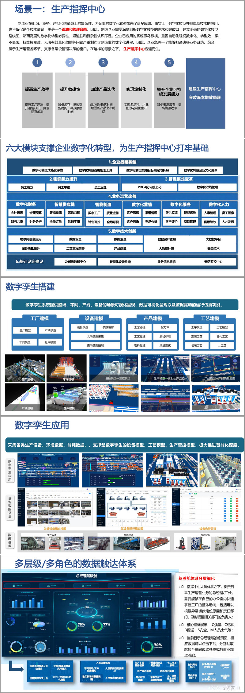 生产指挥中心是企业数字化转型的核心组成部分。它通过综合展示生产运营各环节,支撑各层级管理决策,帮助企业打破业务系统孤岛,实现多品种、小批量的定制化生产。生产指挥中心包括六大模块:企业战略转型、管理模式变革、业务运营改善、数字技术创新、基础设施建设等。