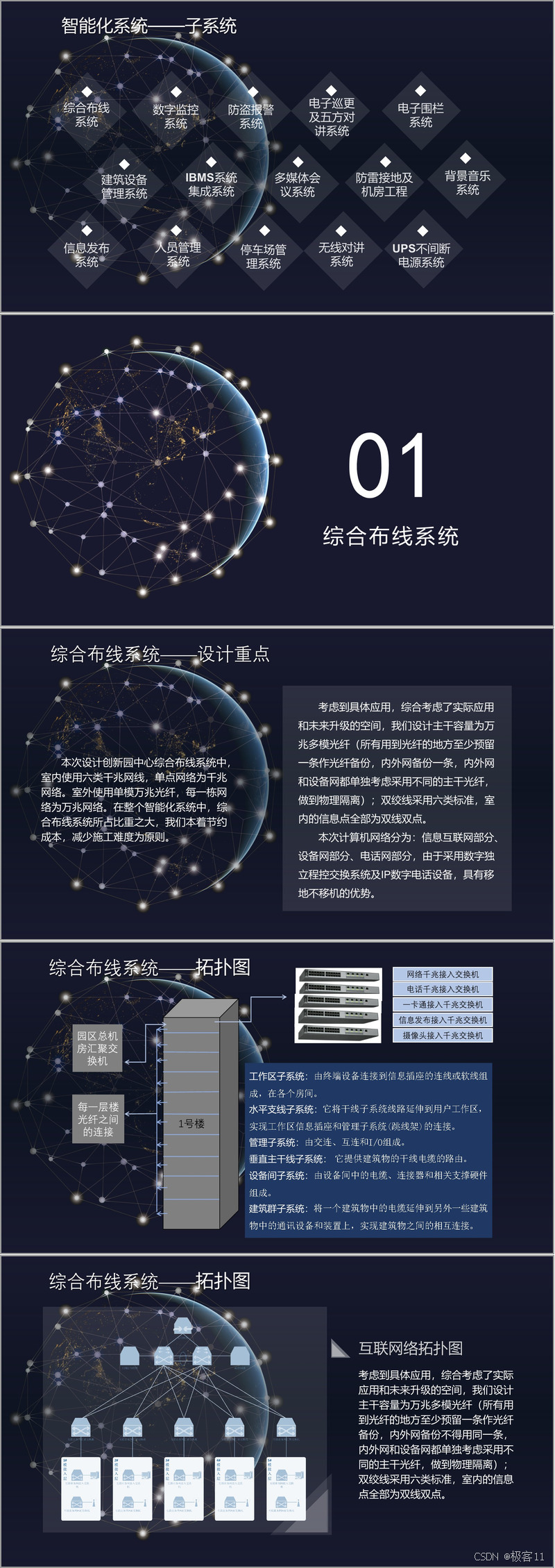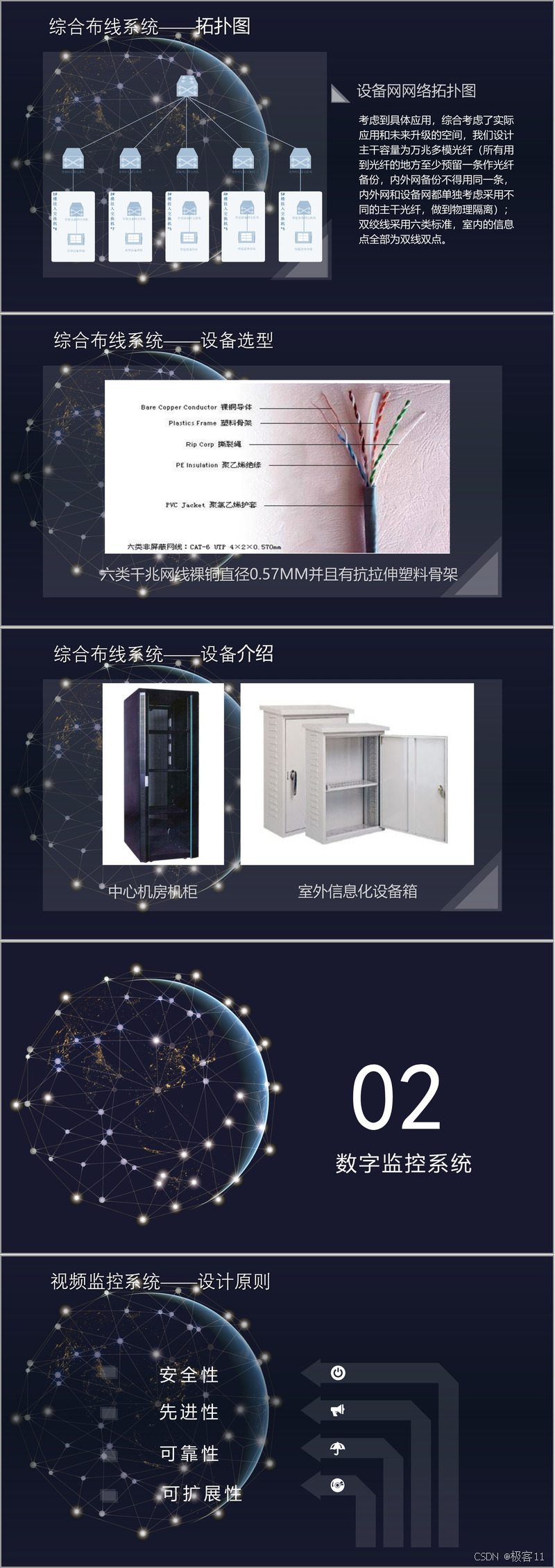 综合布线系统设计考虑了实际应用和未来升级的空间,主干容量为万兆多模光纤,双绞线采用六类标准。室内使用六类千兆网线,室外使用单模万兆光纤。系统分为信息互联网部分、设备网部分和电话网部分,采用数字独立程控交换系统及IP数字电话设备。