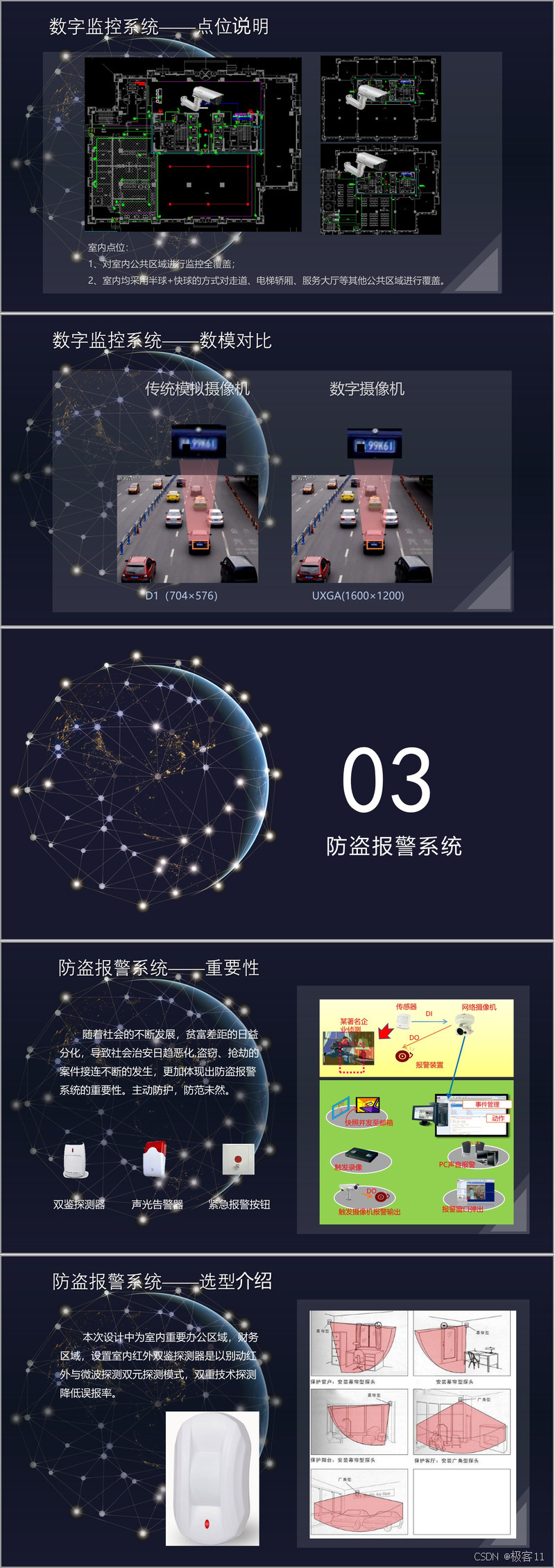 防盗报警系统采用红外双鉴探测器,降低误报率。系统通过传感器、网络摄像机和报警装置实现主动防护和防范未然。